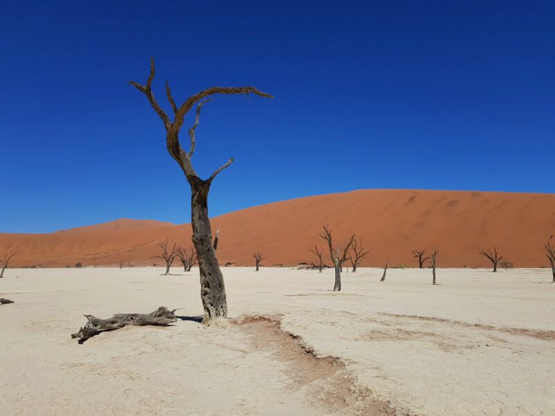 Da liegt es also, das Deadvlei. Umgeben von riesigen, leuchtend orangen Sanddünen unter dem tiefblauen Wüstenhimmel. Die weisse Fläche erscheint von weitem wie schmutziger Schnee, beim Näherkommen entpuppt sie sich als steinharte, rissige Salzkruste. Schwarze Baumstrünke ragen hervor, ausgedörrt, tot. Lebendig sind hier nur die Farben. Gibt es auf dieser Erde ein surrealeres Bild?