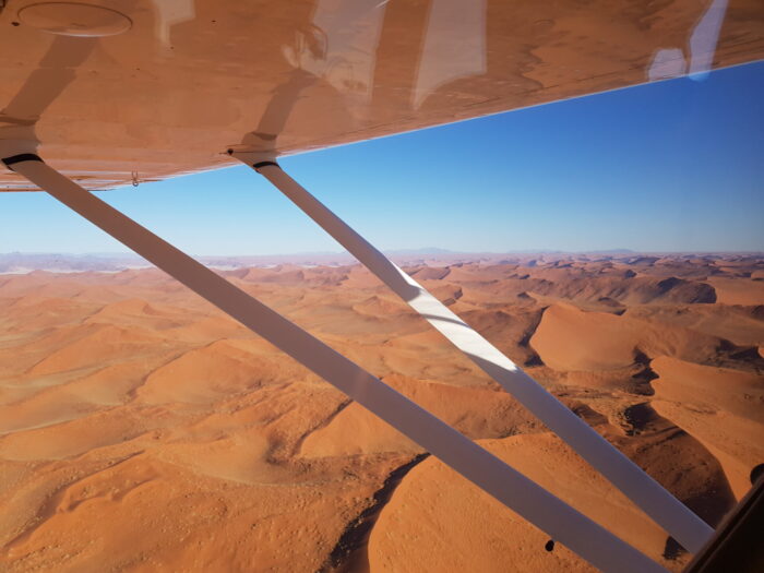 Tsondab – das Tal, die Dünen, die Farben! Gelb, orange, rosa, violett, darüber der tiefblaue Himmel. Endlose Wanderung durch Dünen und Schluchten. Verharren, schauen, staunen, fotografieren. Denkwürdiger Flug über die Namib, nach welchem ich leider das Abendessen ausfallen lassen musste. Die hübsche Fenja, Praktikantin aus Deutschland, die souverän den Betrieb organisierte. Wir waren die einzigen Gäste.