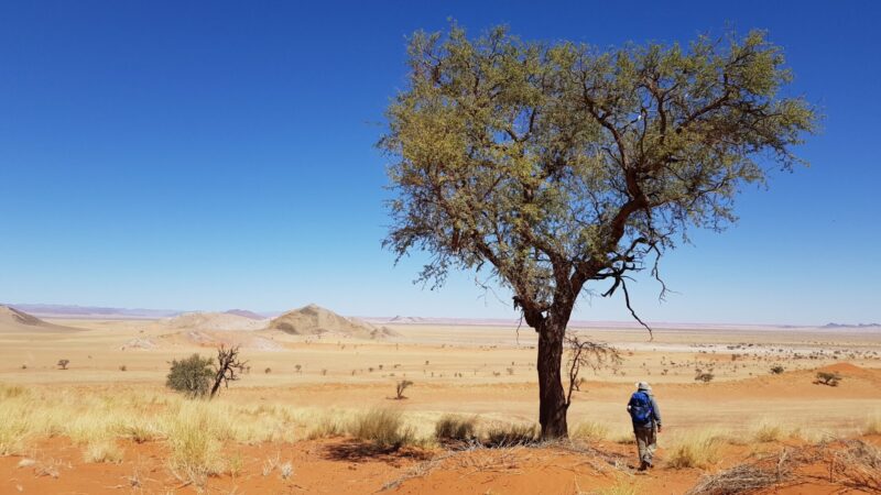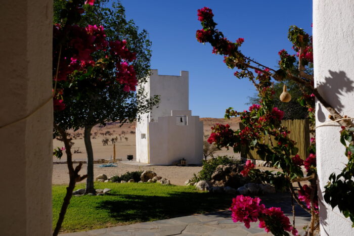 Tsondab – das Tal, die Dünen, die Farben! Gelb, orange, rosa, violett, darüber der tiefblaue Himmel. Endlose Wanderung durch Dünen und Schluchten. Verharren, schauen, staunen, fotografieren. Denkwürdiger Flug über die Namib, nach welchem ich leider das Abendessen ausfallen lassen musste. Die hübsche Fenja, Praktikantin aus Deutschland, die souverän den Betrieb organisierte. Wir waren die einzigen Gäste.