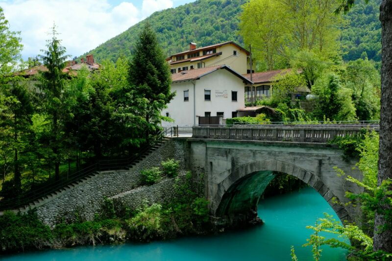 In Most na Soči gibt es zwei, drei Plätze die man mit «schön» bezeichnen könnte. Das umgedrehte Boot am Rande des sogenannten Sees, der Blick von der Brücke auf die Soča und der Kirchplatz. Die Kirche und ein grosser Baum. Steht man am See, ist man doch erstmal sprachlos im Angesicht der Farbe: türkisblau, giftgrün, hat diese Farbe überhaupt einen Namen? Rundherum grüne, kräftige, frische Bäume, Sträucher und Gras. In der Ferne die dunklen Berge. Der Soča und ihrer Farbe machen Wolken nichts aus, ja im Gegenteil, ich habe den Eindruck, die Farbe gewinnt an Kraft. Am liebsten jedoch ist mir die Brücke: Man könnte dort stehen und schauen, sehr lange schauen. Wie ist es morgens, abends, bei Sonnenschein, im Winter? Wie verändert sich die Soča?