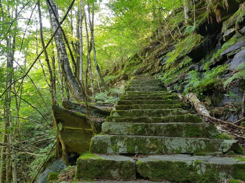 Weiter geht es, über Steinplatten von 1893, über Treppen durch den Wald. Man überquert eine Brücke aus Stein, alt, gebogen; man geht am Friedhof vorbei und nimmt in einem Gasthaus Platz. Es gibt ein einziges Gericht. Das reicht, man bekommt etwas zu essen.