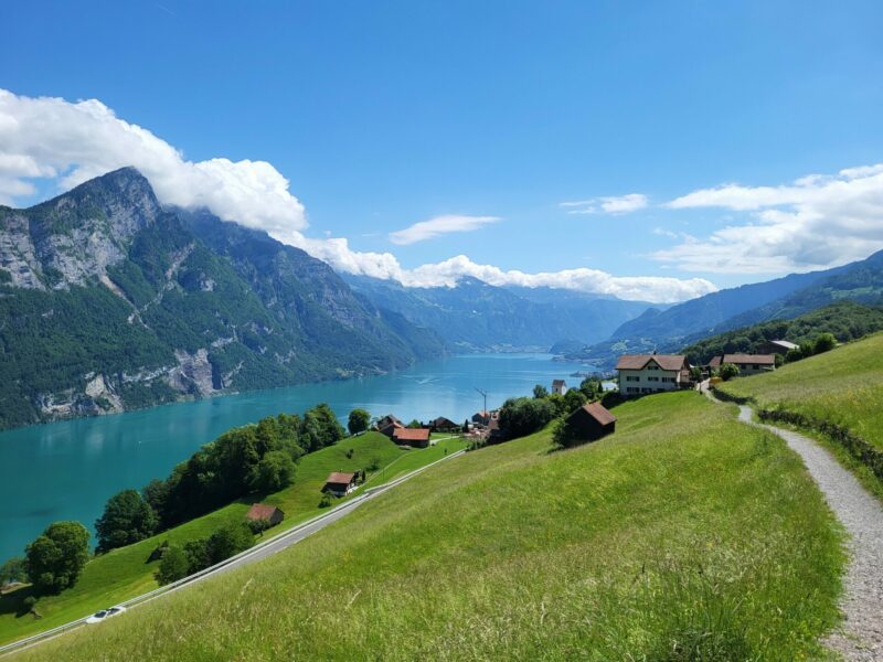Optimales Licht, um den See türkis erscheinen zu lassen, und kein Wanderer in meiner Richtung unterwegs, nur wenige in umgekehrter. Beeindruckend auf die Churfirsten zu schauen und zu wissen, dass man unter ihnen auch schon unterwegs war. Die Dörfer verschlafen, es war ja Feiertag, die Häuser mal sehr herzig, mal eher alternativ.