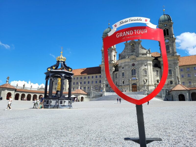 Landschaftlich betrachtet die schönste Etappe: von Rapperswil nach Einsiedeln. Lichte Wälder, kühl, mit frischer, feiner Luft und einem Reh. Danach, auf einer Anhöhe, die Kapelle und das Gasthaus St. Meinrad mit Weitblick. Geschwungene Hügellandschaft, grün, mit Blick auf ferne Alpen, der Himmel blau, betupft mit weissen Wolken, ein perfekter Sommertag. Rotmilan, Grillenzirpen, riesige Kreuzspinne beim Weben ihres Netzes, grasende Kühe auf Hügelkuppen, gepflegte Höfe. Der Sihlsee und das Kloster Einsiedeln rücken ins Blickfeld. Wunderbar. Den heutigen Tag hatte ich mit Laufen über den Holzsteg von Rapperswil nach Hurden begonnen. Die Sonne färbte die vorhandenen Wolken rosa, das Licht glitzerte auf dem Zürichsee und die Wasservögel lärmten zu früher Stunde. Jetzt: Einsiedeln, gleich, das Ziel!