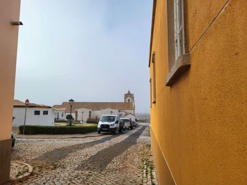 Rückweg über den Trilho Ambiental do Castelejo – zufällig. Obwohl von Menschenhand gestaltet, unglaublich grün, lieblich, voller Gezwitscher. Wildschweine soll es hier auch geben laut Infotafel. Plötzlich ein Knall wie ein Schuss. Meine Güte, denke ich, was wenn ich versehentlich erschossen werde, auf dem Umwelt-Trail? Sicherheitshalber rufe ich laut: Hallo! Wildschweine würden das nicht tun, denke ich. Haha, blamiert habe ich mich wohl. Um die Ecke kommt mir eine Frau mit zwei Teenagern und einem böse schauenden Hund entgegen. Also lebend in Vila do Bispo angekommen.