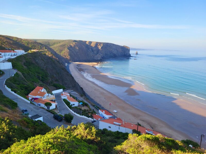 Tag 13. Água sem gás und Vinho verde, zurück in Vale da Telha. Davor Wandersachen gewaschen. Davor geduscht. Davor war ich in Arrifana. An sich ein vollkommen banaler Ort. Die kleinen, hübschen, alten, wenigen Häuschen kleben am Hang, oberhalb des schönen Strandes. Auf der Steilküste wird gebaut oder ist schon gebaut worden, gross, leicht protzig, mehrstöckig. Unpassend. Aber mit Blick auf das blaue Meer. Arrifana als Urlaubsort? Niemals. Auch wenn das Café «Sea You Surf» sehr sympathisch war, das Chicken toast, Galão und Walnusskuchen äusserst lecker.