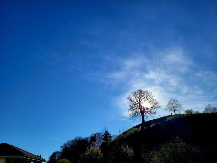 Frühling pur! Sprossende Bäume, blühende Blumen und ein intensiv grünes Gras, blauer Himmel, in der Ferne weisse Gipfel, Vogelgezwitscher ohne Unterlass, der Schrei von etlichen Rotmilanen. Einer der Milane kreist zuerst über dem Feld, dann über mir. So tief, so nahe, dass ich einzelne Federn erkenne, ihm in die Augen schauen kann und einen Schnabelhieb erwarte – der jedoch ausbleibt. Duft nach Bärlauch, nach wildem Kraut. Kühe und Schafe und Lämmer im frischen Gras, neugierig schauend.