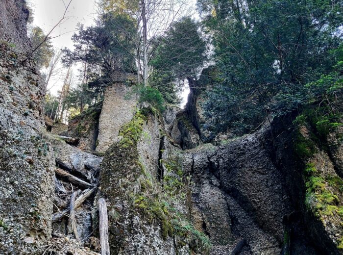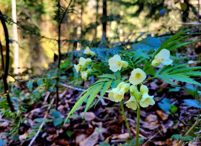 Wunderbar! Von M. geführt, drei Teilnehmer, eine Wanderung für die Sinne. Abseits vielbegangener Pfade, grüner Waldboden voller Blümlein, hohe Tannen, kleine Wasserfälle, Bächlein, spannende Felsformationen, Ursprünglichkeit an vielen Stellen, so wild, als wäre die Zeit stehen geblieben. Eine Ur-Natur, so kommt es mir vor, Plätze, an denen man Stunden verweilen möchte, weit weg vom Lärm, verbauter Landschaft und dem Alltag. Oft werden Touren zu «Kraftorten» angeboten. Da habe ich meine Bedenken … gezielt einen Punkt aufsuchen um «Kraft» zu empfinden? Ich meine, so etwas ergibt sich – so wie jetzt – oder eben nicht. Meine Seele ist also doch nicht blind.
