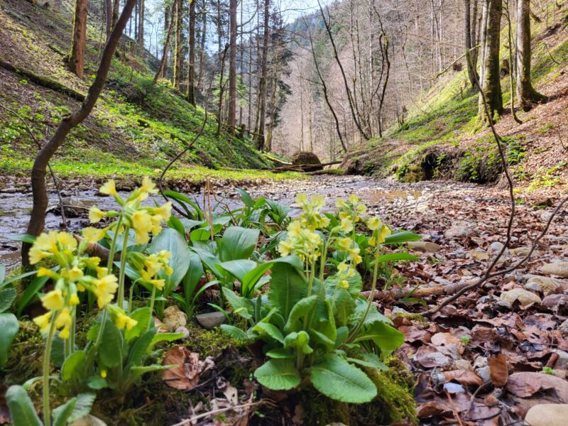 Schlüsselblumen ohne Zahl, Pfad durch Blaubeerbüsche, Wasserplätschern, Dotterblumen, Mooskissen. Dann die Poo-Alp mit Terrasse und traumhafter Aussicht und feinem Mittagessen. Rückweg zum Ausgangspunkt voller Glücksgefühl.