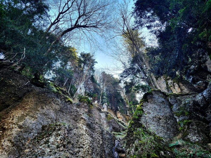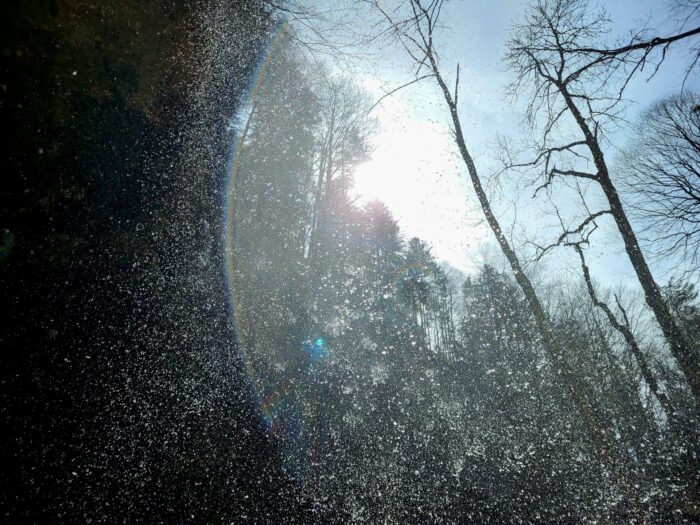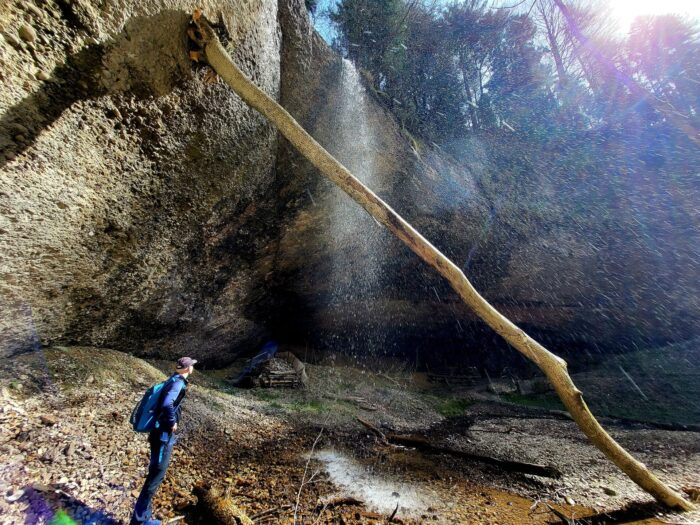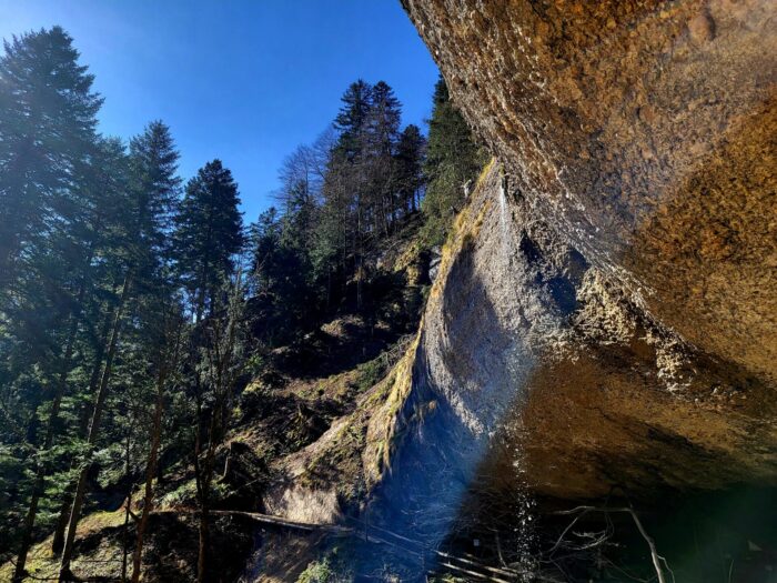 Wunderbar! Von M. geführt, drei Teilnehmer, eine Wanderung für die Sinne. Abseits vielbegangener Pfade, grüner Waldboden voller Blümlein, hohe Tannen, kleine Wasserfälle, Bächlein, spannende Felsformationen, Ursprünglichkeit an vielen Stellen, so wild, als wäre die Zeit stehen geblieben. Eine Ur-Natur, so kommt es mir vor, Plätze, an denen man Stunden verweilen möchte, weit weg vom Lärm, verbauter Landschaft und dem Alltag. Oft werden Touren zu «Kraftorten» angeboten. Da habe ich meine Bedenken … gezielt einen Punkt aufsuchen um «Kraft» zu empfinden? Ich meine, so etwas ergibt sich – so wie jetzt – oder eben nicht. Meine Seele ist also doch nicht blind.