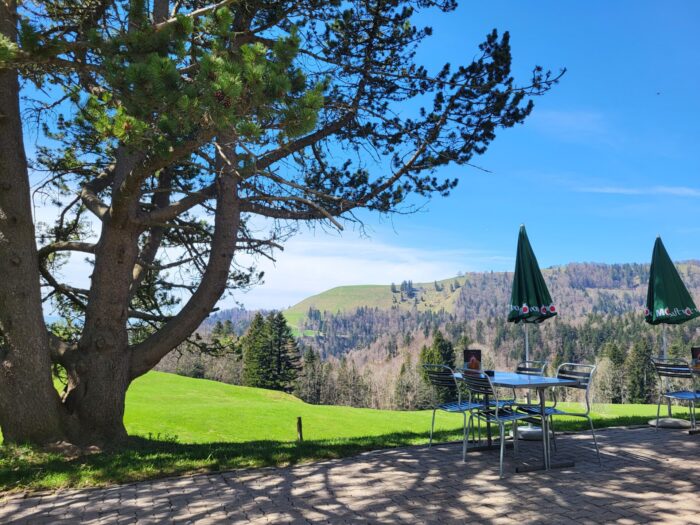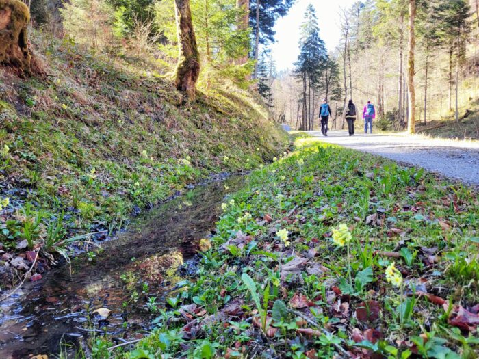 Schlüsselblumen ohne Zahl, Pfad durch Blaubeerbüsche, Wasserplätschern, Dotterblumen, Mooskissen. Dann die Poo-Alp mit Terrasse und traumhafter Aussicht und feinem Mittagessen. Rückweg zum Ausgangspunkt voller Glücksgefühl.