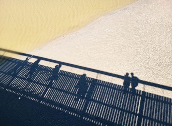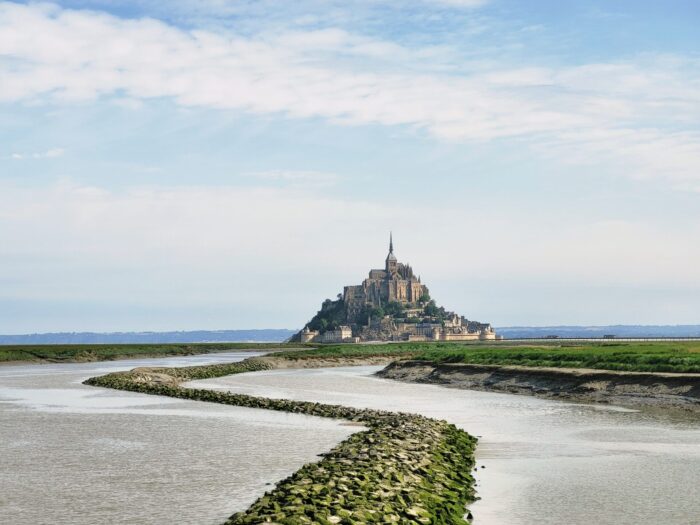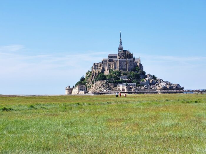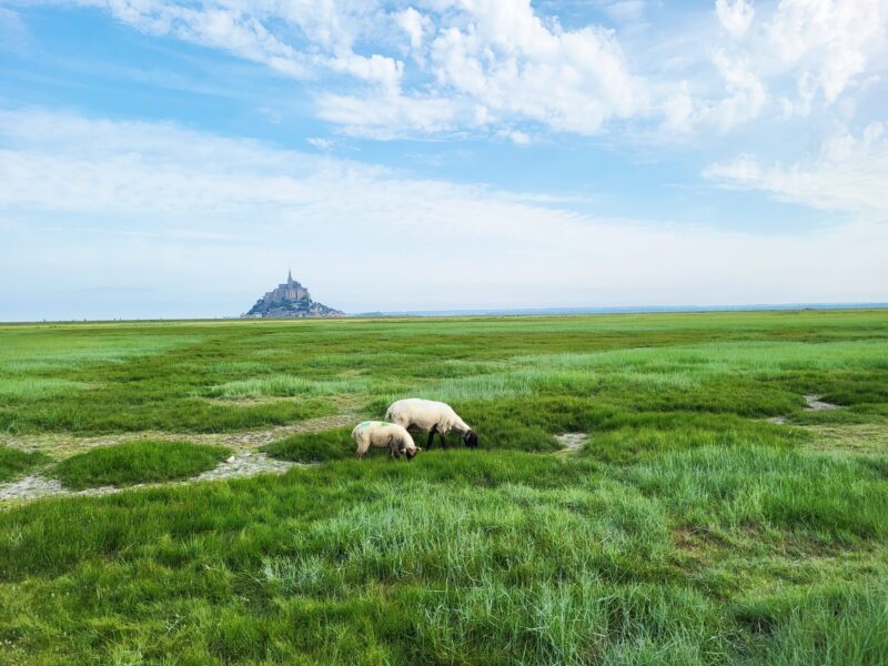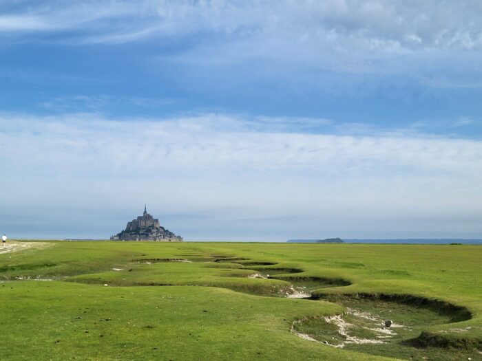 Frühstück und los! Wandernd nähern wir uns durch die Salzwiesen wieder dem Mont-Saint-Michel, bleiben jedoch in gewisser Entfernung, der Blick darauf ist bezaubernd. Schafe auf den Wiesen, Lerchen in grosser Zahl, Kaninchen, Wind, Wolken und Sonne. Und der Blick. Erkennbar die Menschen auf dem Steg, es werden immer mehr, heute gehören wir nicht zu der Menge.