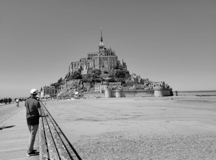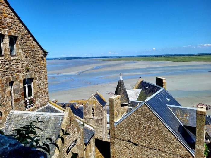 Übernachtung mit Blick auf Saint-Michel. Davor verspeisen wir Lammkarree, das Tier stammt von den Salzwiesen und schmeckt köstlich. Eine Empfehlung des Gastgebers, ein Restaurant an einer Schnellstrasse mit einem Aussehen, das uns – als Nichtwissende – abgeschreckt hätte.