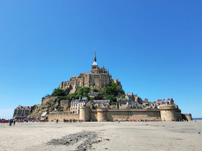 21 km vor dem Ziel sehen wir das erste Mal die Umrisse des St-Michel; wir staunen, und die Spannung steigt: Wir sind bald dort, bei dem Wunder, das man aus Fernsehsendungen kennt. Die Landschaft während der Fahrt ist idyllisch. Wellig, voller Felder, kleiner Wälder und weisser Kühe.