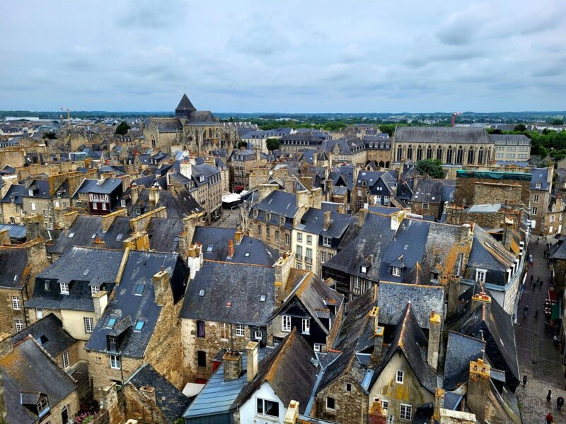Dann betritt man durch ein Tor die eigentliche Altstadt und stellt fest, dass die Häuser und Strassen grosszügiger und herrschaftlicher wirken. Die Stadthäuser sind höher, grösser, breiter; es gibt immer wieder Galerien und Holzschnitzereien. Wir erklimmen auf etlichen Stufen einen Uhrturm und blicken über die Dächer der Stadt und darüber hinweg über grüne Hügel. Die Ansammlung der Dächer erinnert an die Seestadt aus dem «Hobbit», die Dächer sind überwiegend sehr spitz, gedeckt mit grauen Schieferziegeln, die Mauern darunter oft aus gelbem Sandstein. Wieder unten, laufen wir zum Château – es wurde uns als sehenswert empfohlen. Es ist tatsächlich eine hervorragend präsentierte Anlage des 13. bis 17. Jahrhunderts. Nicht alte Möbel, Spiegel oder eingestaubte Gemälde dominieren das Bild, sondern die Räumlichkeiten an sich, die Bauweise. Erklärungen auf kleinen Tafeln lassen lebendige Vorstellungen des Lebens damals vor dem inneren Auge erstehen.