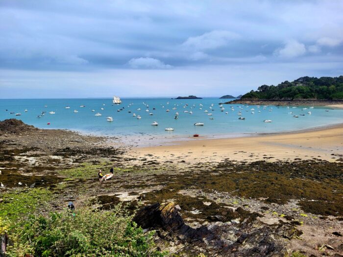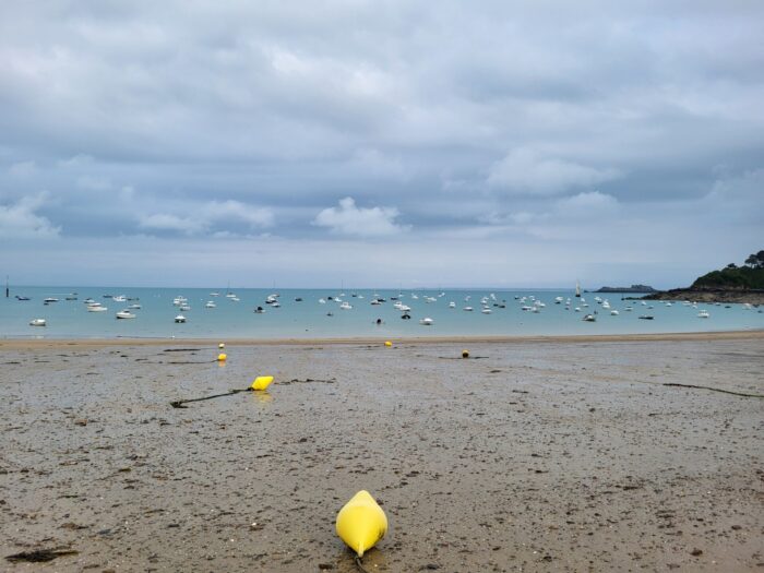 Zurück nach Dinan, entlang dem stillen Wasser, und Fahrt zum Pointe du Grouin, einer Landspitze, welche unendlich weite Blicke über das Meer erlaubt. Es ist Ebbe; raue Felsen unter uns, traumhafte Pflanzen neben uns. Wir wandern nach Port Mer. Pastis, ein Bier, Blick über Bojen, die auf dem Sand liegen, kleine Boote in Schräglage am Strand, das Meer zieht sich weiter zurück. Die schönsten Farbschattierungen von blau, grau und grün. Der Himmel ist bewölkt, aber nicht farblos, das Wasser auch nicht. Ja, der Blick auf das Meer und in der Ferne die Konturen des Mont-Saint-Michel!