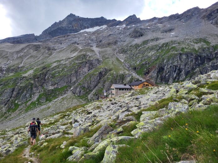 16.30 Uhr, Friesenberghaus. Seit einer kleinen Weile sind wir da. Bergschuhe aus, Hüttenschuhe an, Zimmer bezogen. Grosses Glück: Stockbetten, nur wir fünf Frauen, ich darf oben schlafen. Der erste Tag ist geschafft, 1300 Höhenmeter hochgelaufen, vier Stunden Gehzeit – meine Güte, also den Anstieg merkt man! Die Gruppe von acht Leuten zerfällt sehr bald nach dem Start in zwei Teile, fünf und drei. Teilweise warten wir 15 Minuten auf die drei Langsamen. Der Weg schlängelt sich auf schmalem Pfad hoch und höher, über Wurzeln und Steine, man steigt und schwitzt und steigt und schwitzt. Trinkpause. Wunderbare Sicht auf Berge und Gletscher.