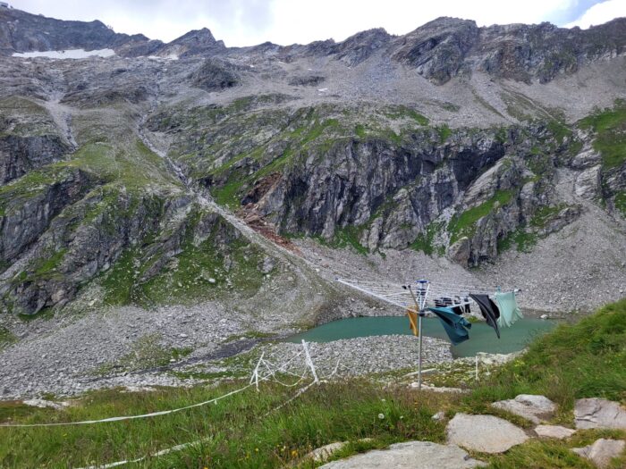 Steigen und schwitzen. Trinkpause nahe einem Bergbach, wunderbares Gras, Blick auf karge, steinige Hänge. Weiter hoch, Steinplatten, die Hütte kommt in Sicht. Auf dem letzten Wegstück macht sich leichte Übelkeit bemerkbar. Ist es die Anstrengung? Ich habe den Eindruck, dass ich die Nüsse und Beeren (mein Mittagessen) nicht verdauen kann. Auf der Hütte bestelle ich mir einen Enzianschnaps. Und Pfefferminztee. Danach fühle ich mich wohl, und langsam meldet sich der Hunger. Ja, der erste Tag ist geschafft. Morgen soll es regnen.