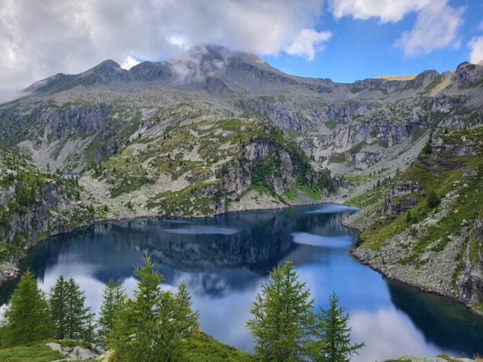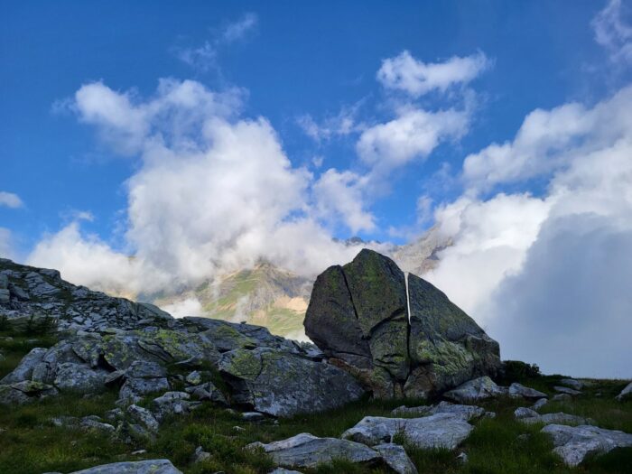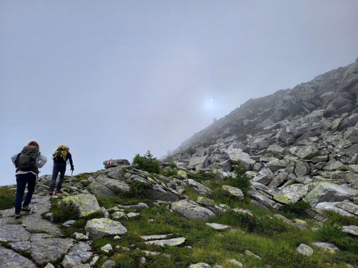 Der nächste Morgen beschert uns faszinierende Lichtspiele durch Wolken und Sonne. Der Wetterbericht gibt ein gemischtes Bild ab. Los geht’s, anfangs noch markiert, hoch zum ersten Übergang. Dann beginnt das kleine Abenteuer, die ehemaligen Wege … Es kommt kurzer Regen auf, ausreichend, um für eine ganze Weile Felsblöcke und Gras in rutschige Partien zu verwandeln. Wolken senken und heben sich, Aussicht verschwindet und wird wieder freigegeben. Schuhe mittlerweile nass, es ist kühl, M. muss immer wieder nach dem Weg suchen, es geht hoch, es geht runter, Zeit vergeht, Kraft wird verbraucht. A. empfindet die kühle Nässe und die mangelnde Sicht als belastend. Ich beginne mich zu sorgen, ob meine Ausdauer für den letzten Aufstieg noch reichen wird.