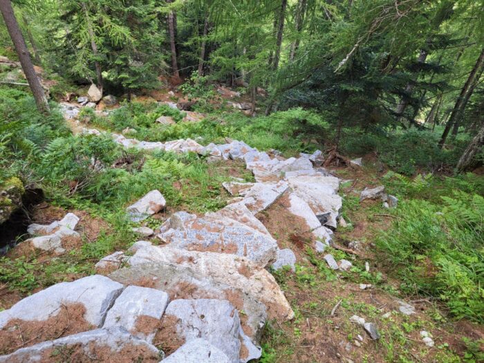 Irgendwann stossen wir wieder auf den markierten Weg. Mittlerweile nerven mich die häufigen Pausen, die wegen des Hundes eingelegt werden; ich gehe alleine langsam weiter, überquere Felsblöcke und fühle mich wohl. Der Hund benötigt grasige Umwege. Wir erreichen die letzte Bocchetta, stehen in grauen Wolken, hören Alphörner, und darüber freuen wir uns, der Klang kommt von unserem Refugio, das wissen wir. Abstieg, kettengesichert, steil, geröllig und rutschig, gruselig gemacht. Ich halte mich fest an Kette und Fels und merke, wie die Fingerkuppen leiden, eine dünne Schicht Haut wird abgeschrubbt. Weiter, weiter. Nach mehr als acht Stunden (statt angedachten fünf) erreichen wir die Hütte, bald gibt es Abendessen. Insgesamt sind wir nur noch acht Gäste, viele haben storniert wegen des Wetters. Ich schlafe grossartig, habe das Dachgeschoss für mich alleine, kippe das Fenster, ziehe eine Mütze an und gute Nacht. Die Beine sind sehr müde.