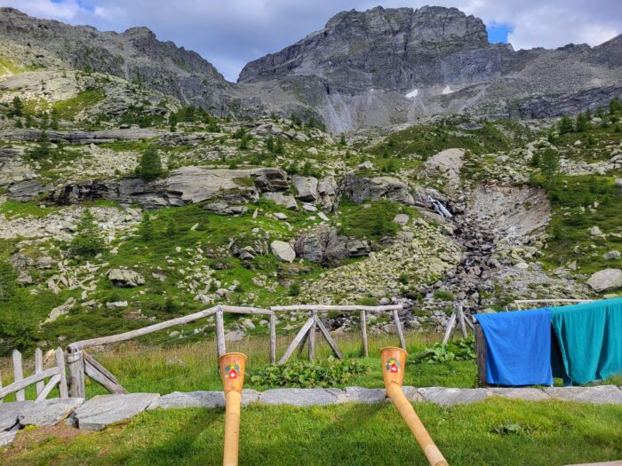Wir entrinnen den Besuchern von San Carlo, indem wir mit dem Aufstieg beginnen. 1200 Hm auf 5 km zum Rifugio, einfacher, aber steiler Aufstieg, wir schwitzen sehr. Zum Abendessen gibt es feinste Minestrone, Spagetti bolognese, Dessert.