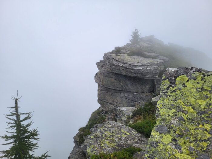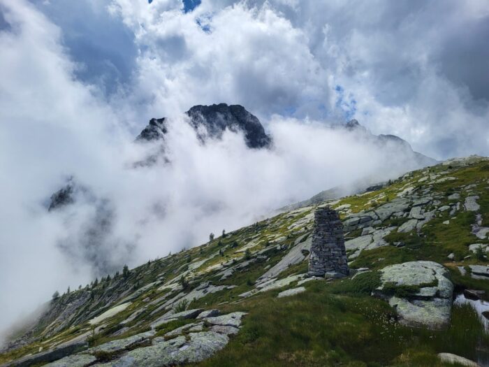 Der nächste Morgen beschert uns faszinierende Lichtspiele durch Wolken und Sonne. Der Wetterbericht gibt ein gemischtes Bild ab. Los geht’s, anfangs noch markiert, hoch zum ersten Übergang. Dann beginnt das kleine Abenteuer, die ehemaligen Wege … Es kommt kurzer Regen auf, ausreichend, um für eine ganze Weile Felsblöcke und Gras in rutschige Partien zu verwandeln. Wolken senken und heben sich, Aussicht verschwindet und wird wieder freigegeben. Schuhe mittlerweile nass, es ist kühl, M. muss immer wieder nach dem Weg suchen, es geht hoch, es geht runter, Zeit vergeht, Kraft wird verbraucht. A. empfindet die kühle Nässe und die mangelnde Sicht als belastend. Ich beginne mich zu sorgen, ob meine Ausdauer für den letzten Aufstieg noch reichen wird.