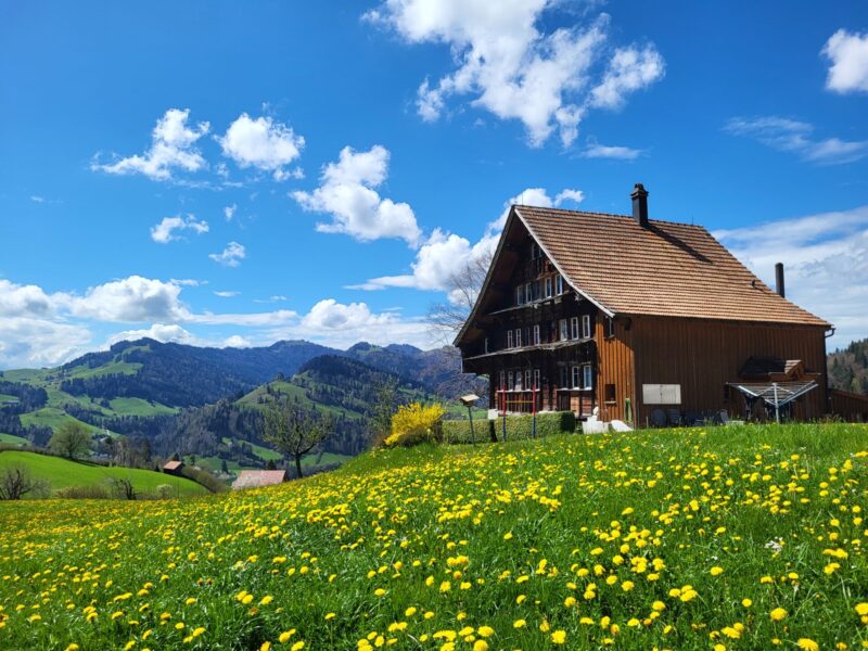 Es ist ein nebliger, feuchter Herbsttag, aus dem Kühe schemenhaft rausschauen und kauen. Mammutbäume säumen den Einstiegsweg; sie werden noch ein wenig wachsen müssen, bis sie ihrem Namen alle Ehre machen, hübsch sind sie auch in klein. Dann beginnen die angekündigten verschlungenen Pfade um den Uetliberg. Diese Pfade sind einsam, schmal und glatt wie Schmierseife. Jeder Stein, jede Wurzel ist nass und glitschig. Junge Bäumchen, hohes Gras, Büsche und auch mal ein dornenbewachsener Zweig, an denen man sich festhält, verhindern ein Rutschen den Hang abwärts. Keine grossen Höhenunterschiede, angenehm wäre es trotzdem, nicht hinunterzugleiten. So wird aus einem Spaziergang bei trockenem Wetter eine kleine herausfordernde Tour. Der Wald mystisch schön, bunt, nebelverhangen. Ich meistere Meter um Meter, nehme mich in acht vor glatten Stellen, wage mich jedoch unbedacht auf ein Holzbrett, welches eine morastige Stelle überquert. Ich setze an zum ersten Schritt und – da liege ich. So schnell war ich noch nie in ganzer Länge auf dem Boden. Der Rucksack verhindert grösseres Weh, und ich stehe auf, etwas verdutzt und verlegen lächelnd. Ja, ich kann weiter, nichts passiert … Nur die Erdflecken auf meiner Hose deuten das Missgeschick an.