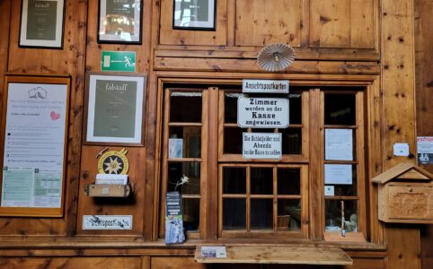 24. Juli, 16.18, Kasseler Hütte. Die Gaststube ist holzgetäfelt, urig-gemütlich, im Ofen brennt ein Feuer, ausgestopfte Bergtiere zieren die Wände: Gemse, Marde...